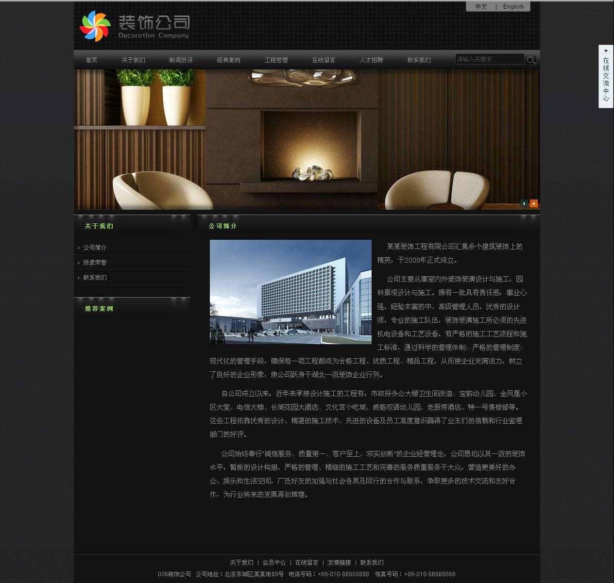 公司主要從事室內外裝飾裝潢設計與施工,園林景觀設計與施工。擁有一批具有責任感,事業心強,經驗豐富的中、高級管理人員,優秀的設計師,專業的施工隊 伍,裝飾裝潢施工所必須的先進機電設備和工藝設備,有嚴格的施工工藝流程和施工標準,通過科學的管理體制、嚴格的管理制度、現代化的管理手段,確保每一項 工程都成為合格工程、優質工程、精品工程,從而使企業充滿活力,樹立了良好的企業形象,使公司躍身于湖北一流裝飾企業行列。